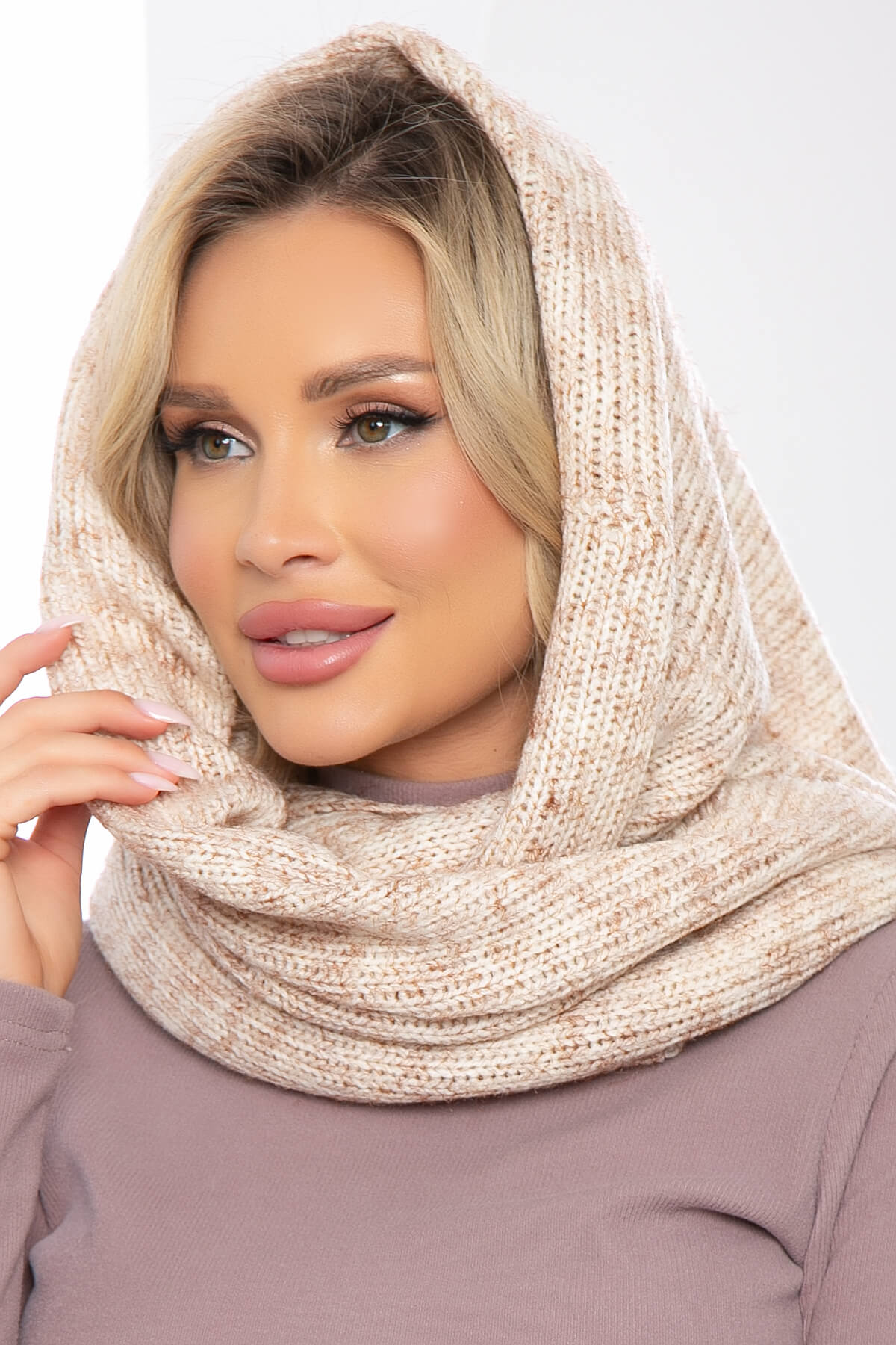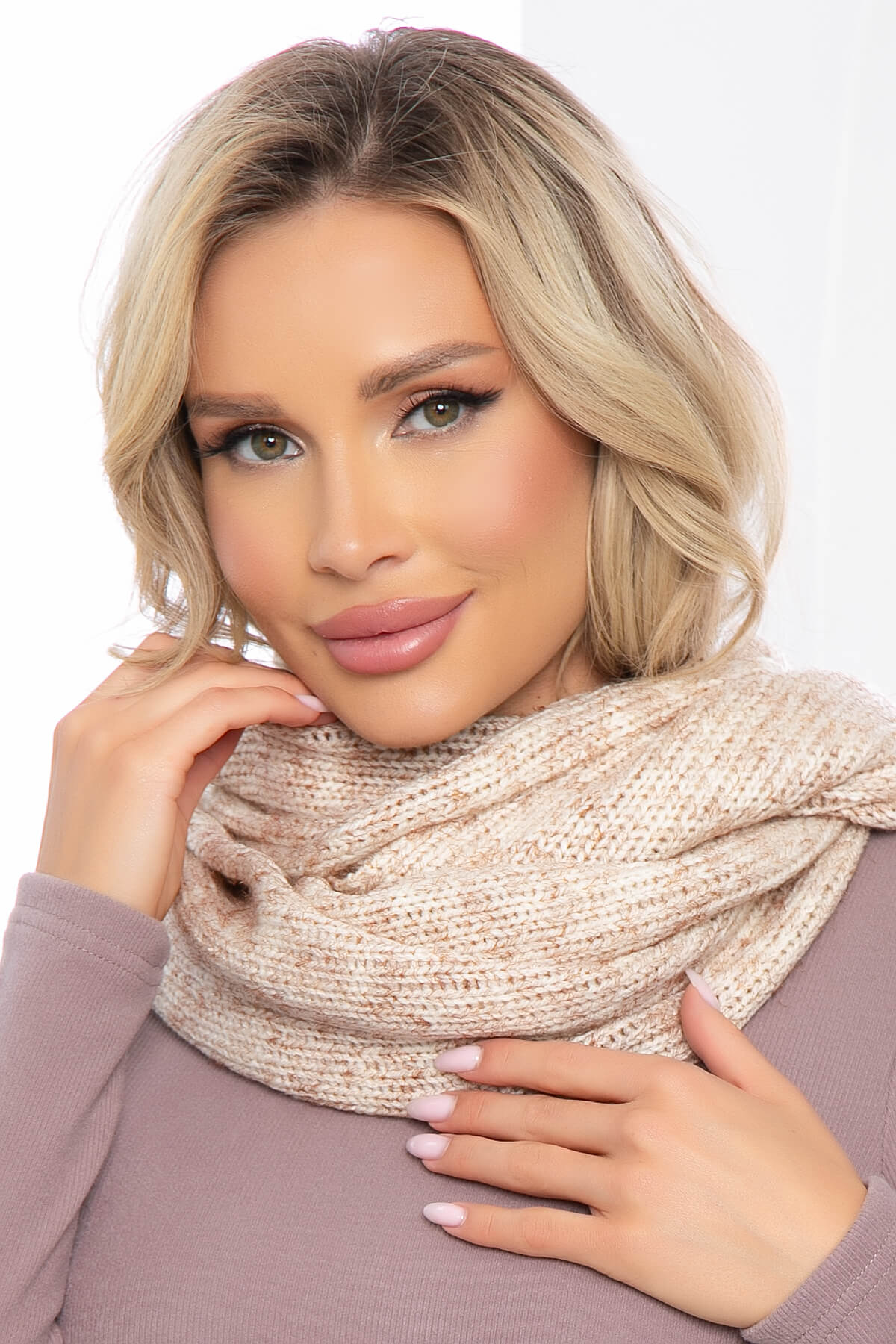 Гладкий и мягкий вязаный снуд легко драпируется в два оборота. Является альтернативой шапкам и капюшонам. Базовый оттенок снуда позволяет сочетать его практически с любым цветом верхней одежды.