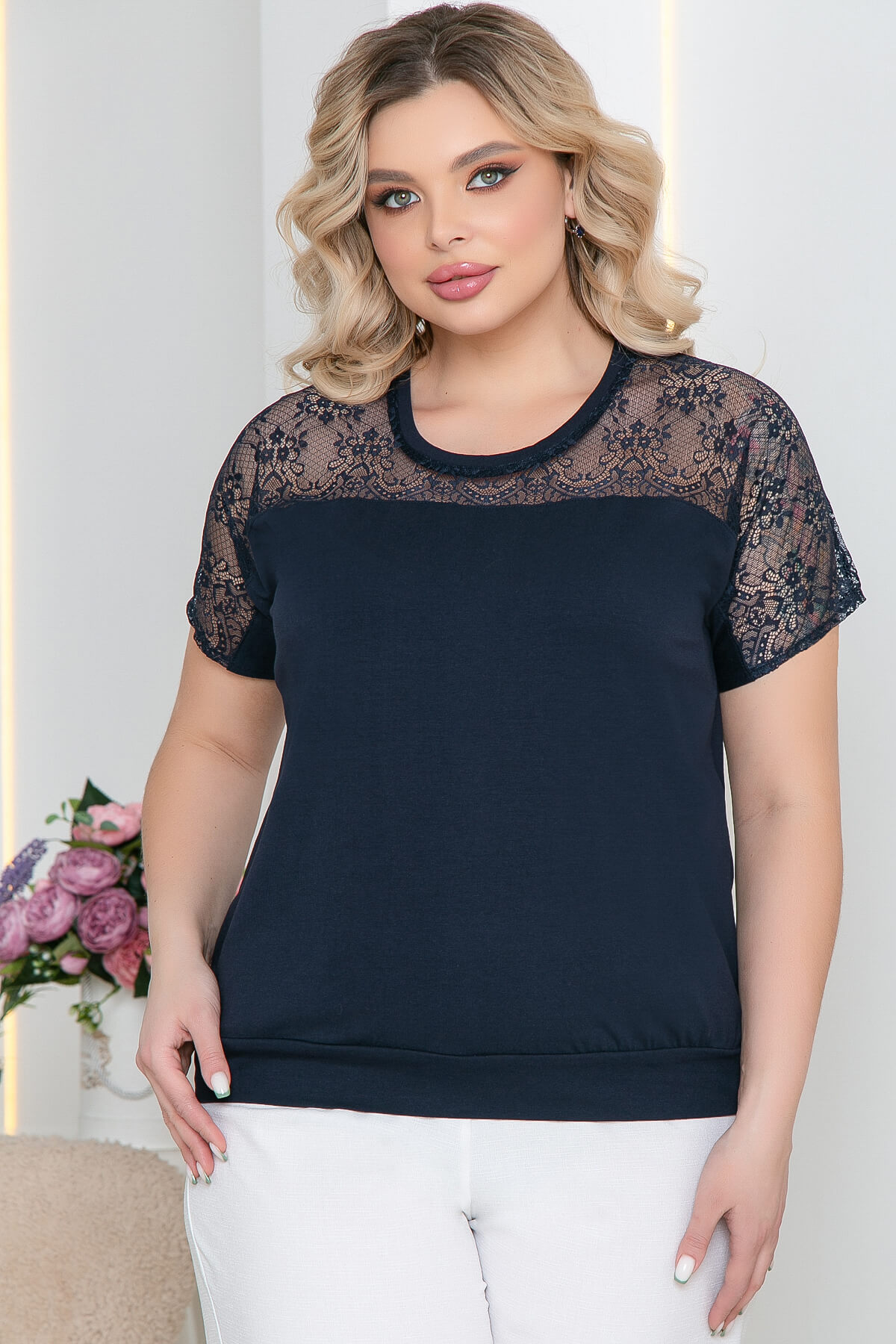 Блуза с акцентным передом и с цельнокроеным рукавом, украшенными гипюром. Отлично смотрится как с брюками, создавая деловой стиль, так и с джинсами. Идеально подходит для повседневной жизни.