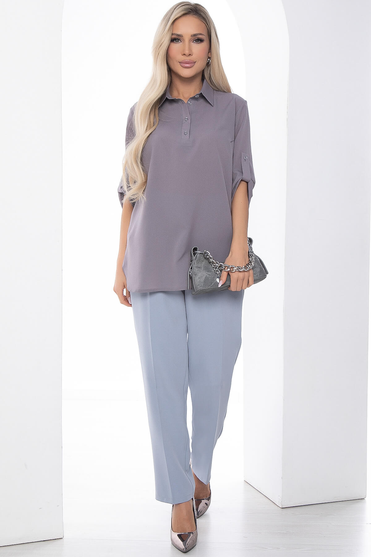 Лёгкая блуза свободного кроя в сером оттенке! Блуза с удлиненной спинкой, края скруглены, по бокам разрезы. Классический отложной воротник, по переду застёгивается на 4 пуговицы. Рукав три четверти, на пате. По спинке есть акцентная деталь - кокетка. Такая блуза подойдёт для создания офисного образа, а также её можно использовать в повседневных ансамблях.