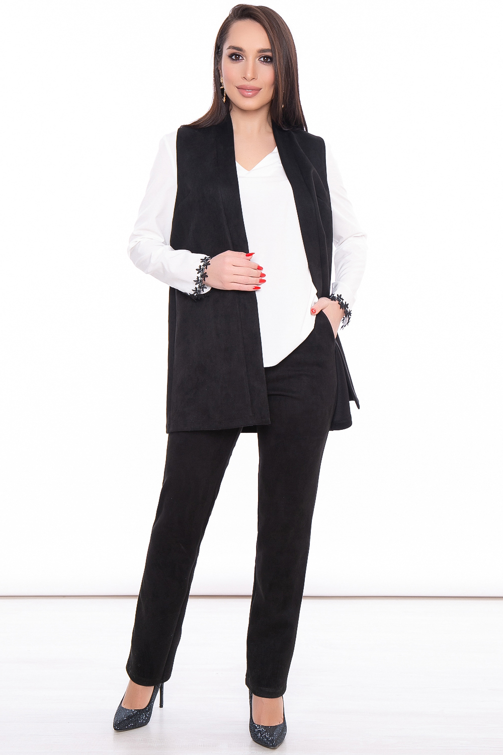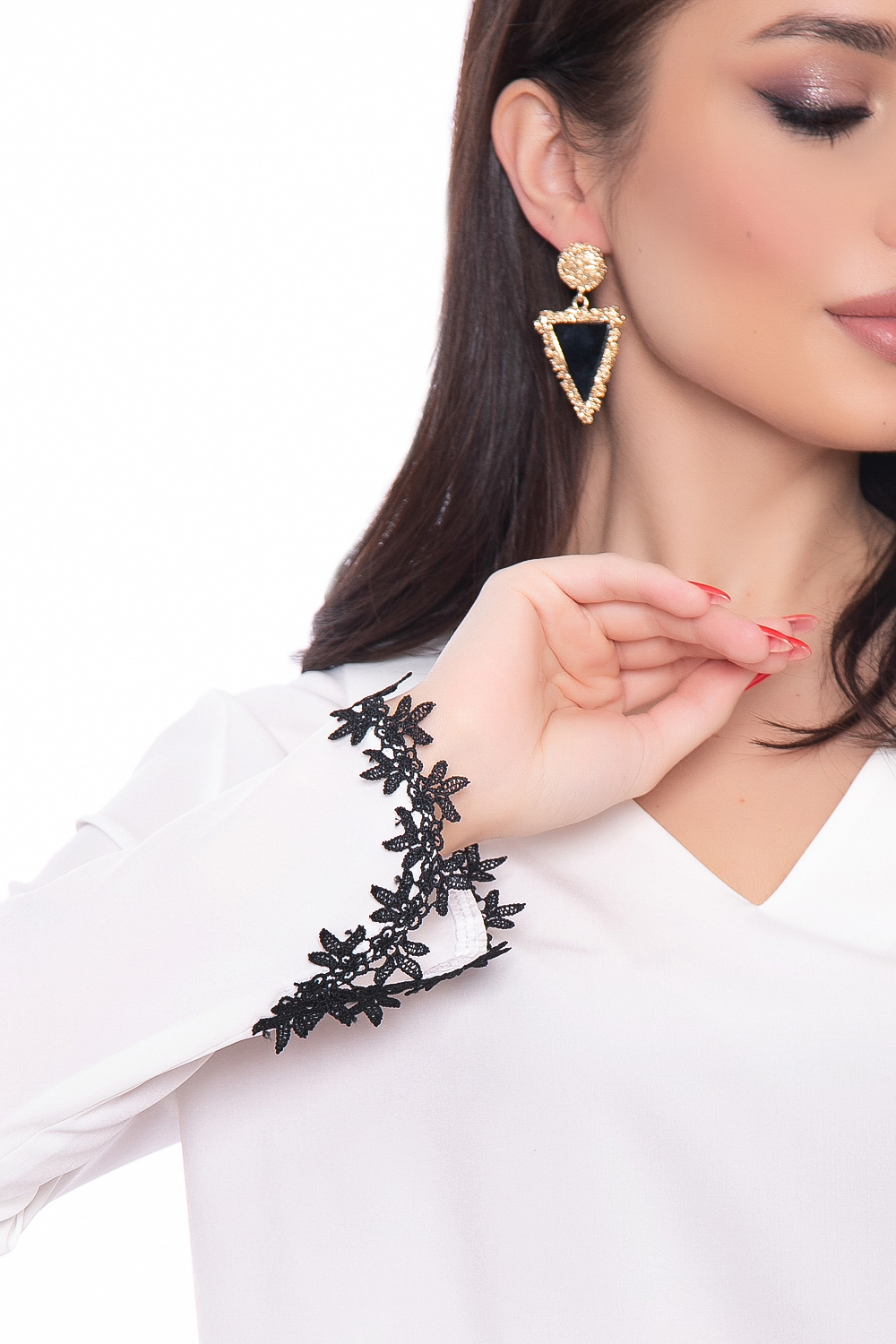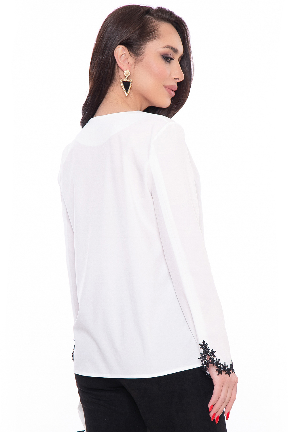 Шикарная блуза для создания элегантных классических и вечерних образов. Отделка на рукавах дополняет образ и прекрасно комбинируется с жилетом или жакетом. Изящный V-образный вырез горловины, рукав втачной, длинный.