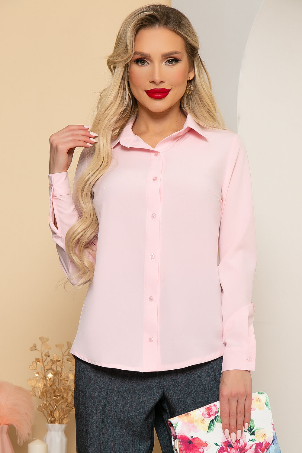 Блуза полуприлегающего силуэта, выполненная из приятной к телу ткани, в красивом розовом оттенке, который хорошо будет сочетаться с Вашим деловым гардеробом. Рукав втачной, длинный, низ рукава на манжете. Спинка скруглена.