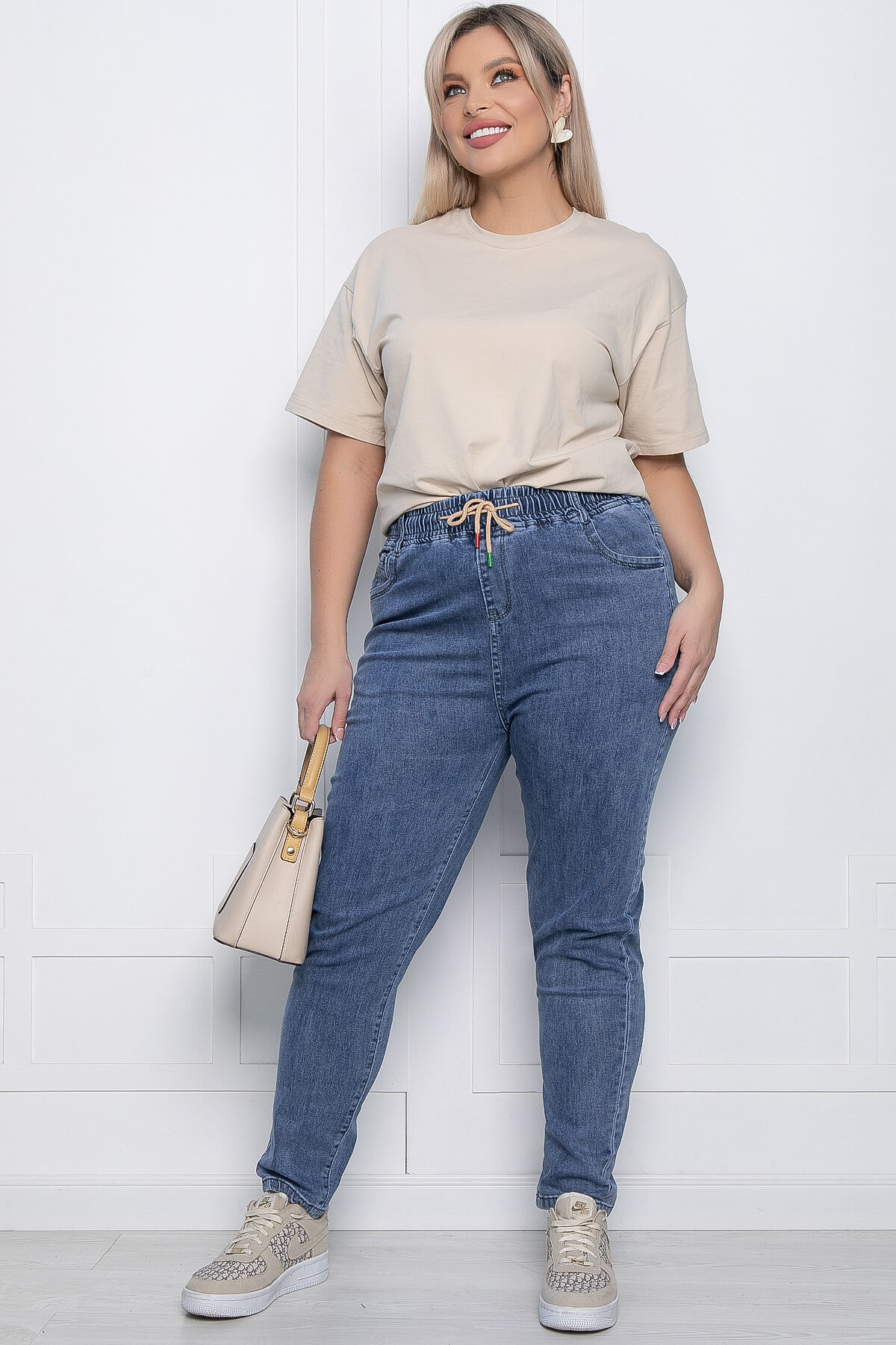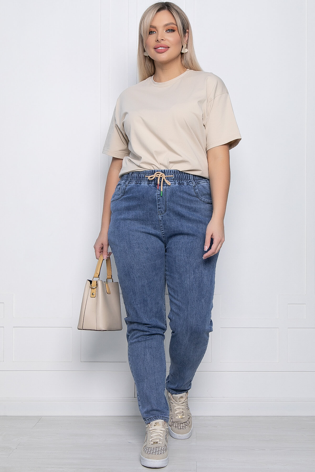 В гардеробе каждой девушки синие джинсы будут востребованы всегда, ведь их можно считать классикой. Сочетайте с футболками, топами или с блузками, так как эти джинсы идеальны для повседневной жизни. Талия на резинке, вставлен шнурок в пояс.