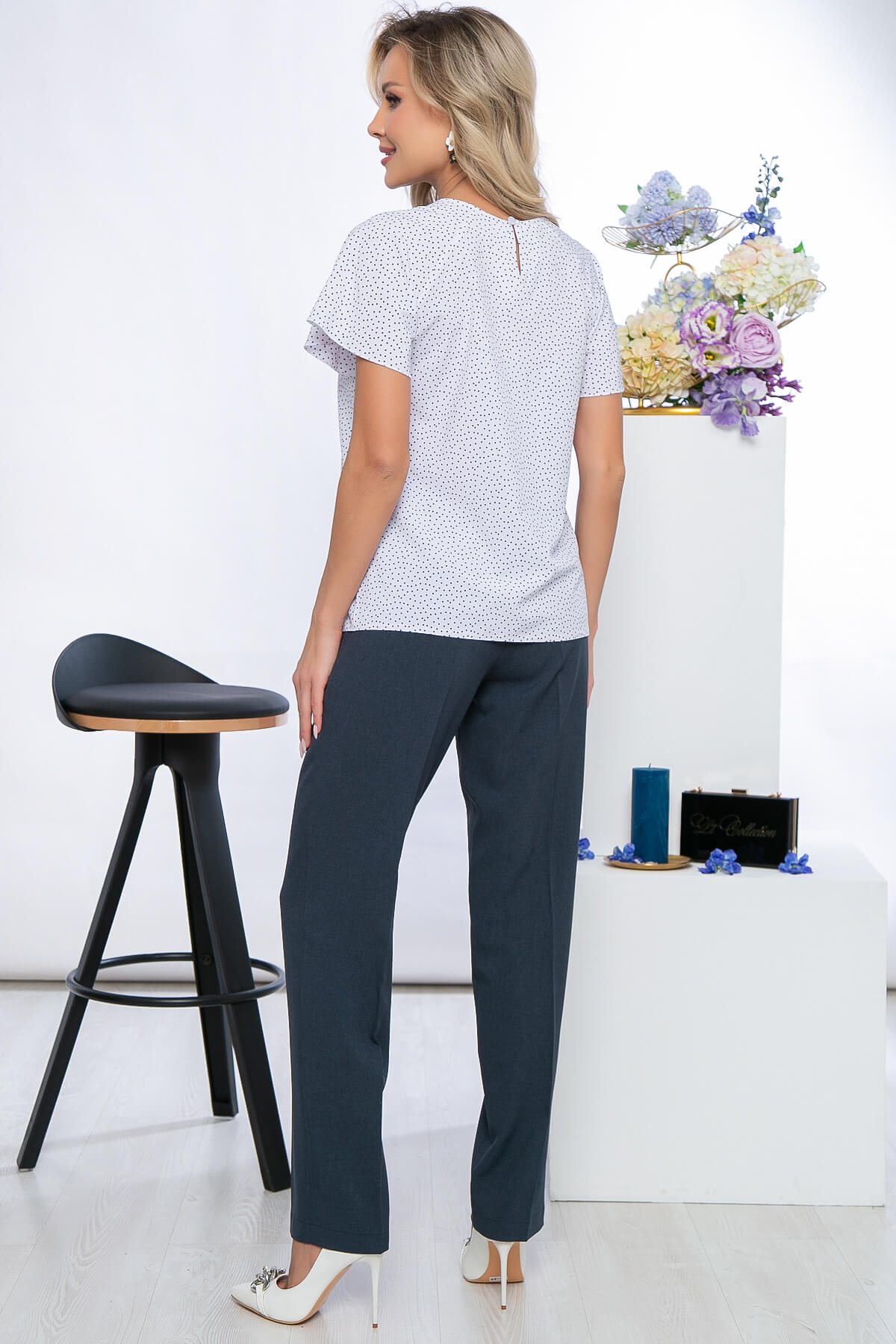 Элегантный костюм, состоящий из брюк с высокой посадкой на резинке и блузы свободного кроя. Очень женственный комплект в стильной расцветке подойдет на любой случай. Блуза свободного кроя, округлый вырез горловины с имитацией галстука. Рукав короткий, цельнокроенный.