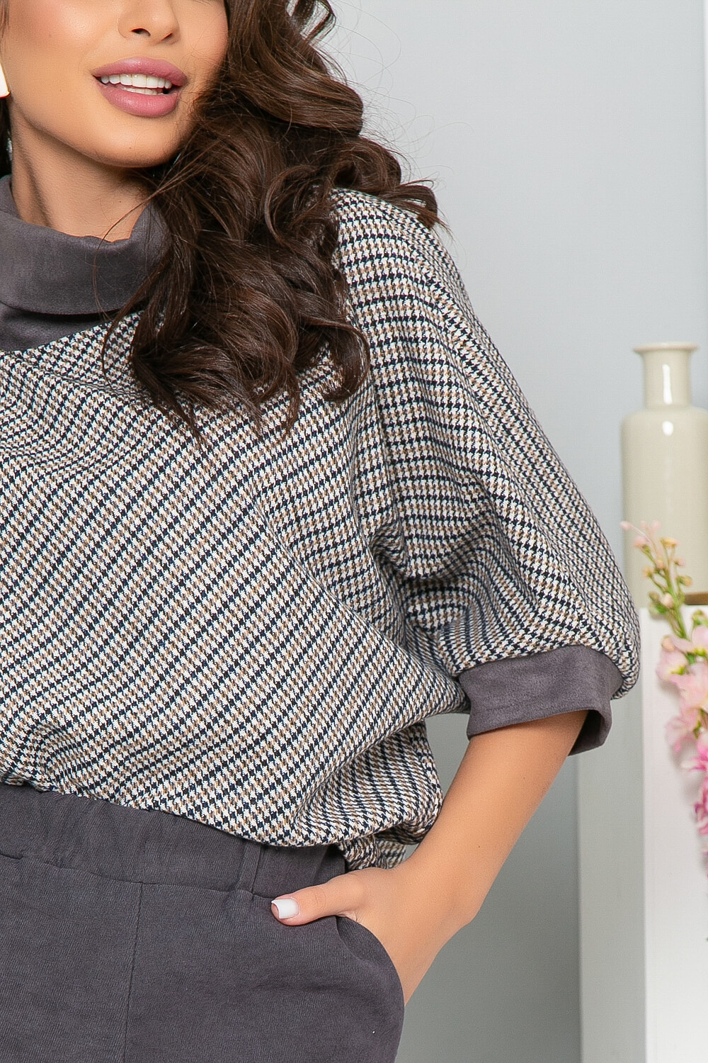Костюм-двойка, состоящий из классических брюк прямого кроя и джемпера свободного кроя. Преимущество комплекта в том, что Вы сможете самостоятельно носить как джемпер, так и брюки. В повседневном образе смело сочетайте с лоферами или ботинками, а если нужен более официальный образ - то с туфлями на каблуке. Костюм выполнен из плотной костюмной ткани. Акцентом данной модели является пройма рукава - "Летучая мышь".