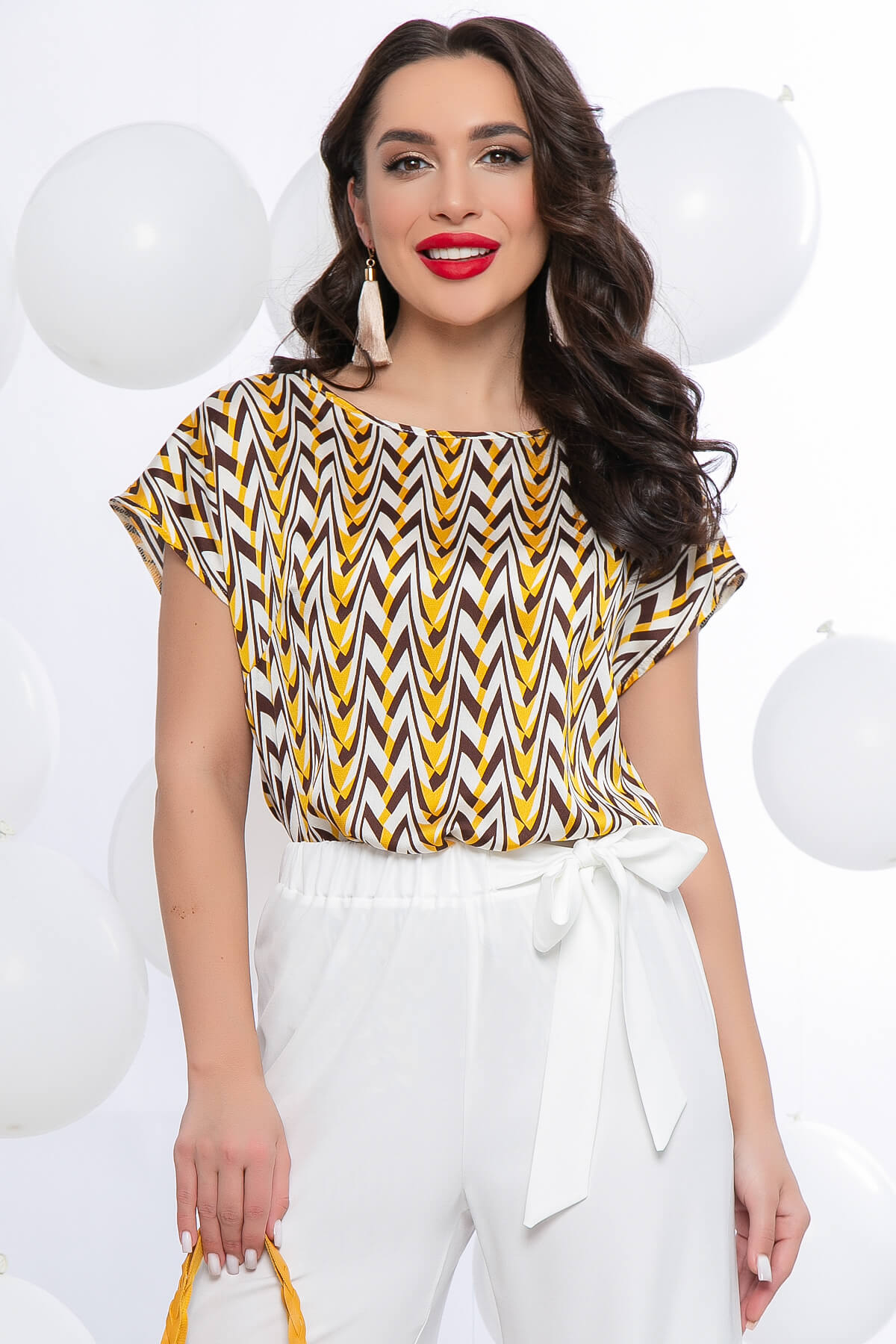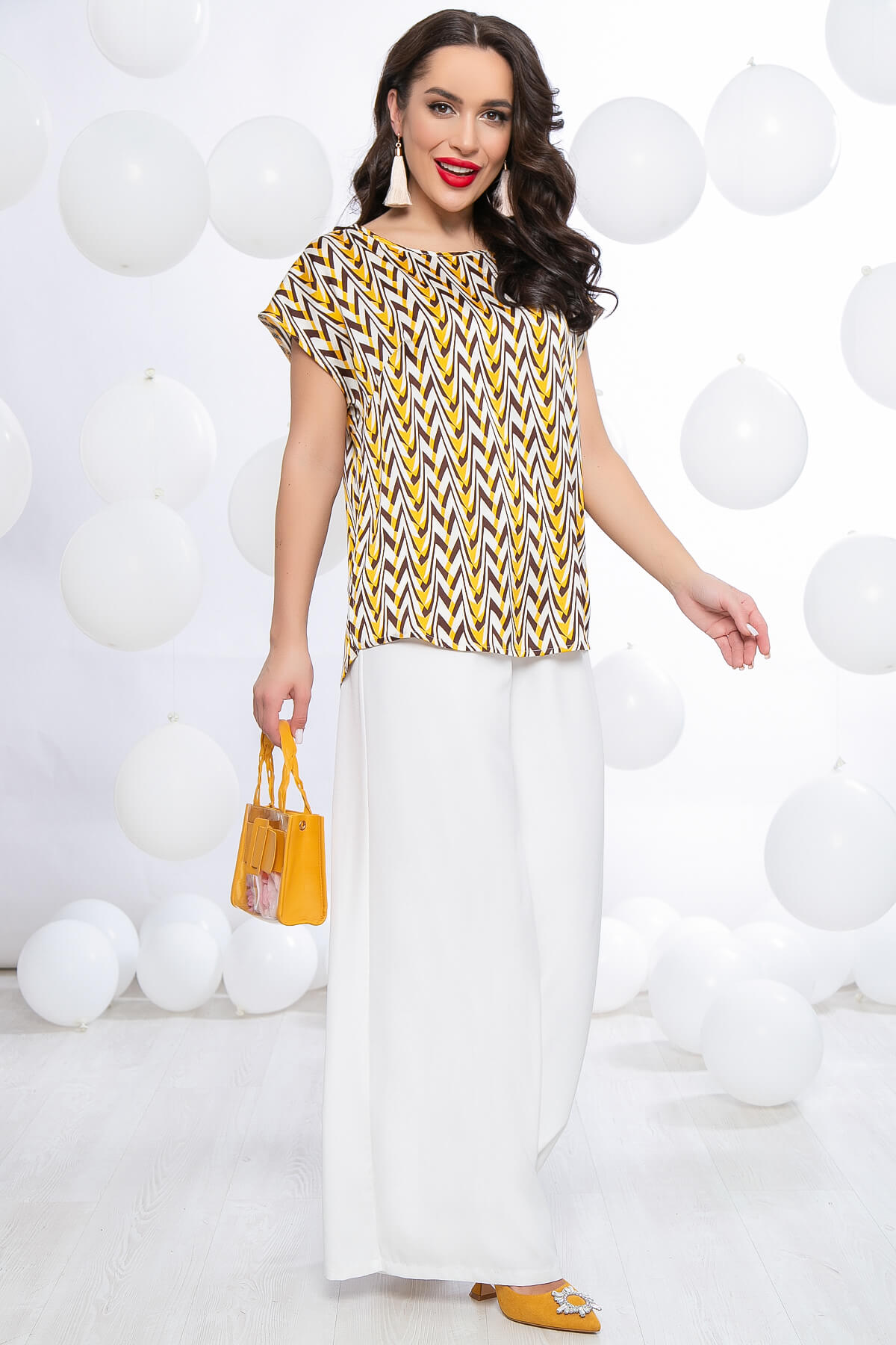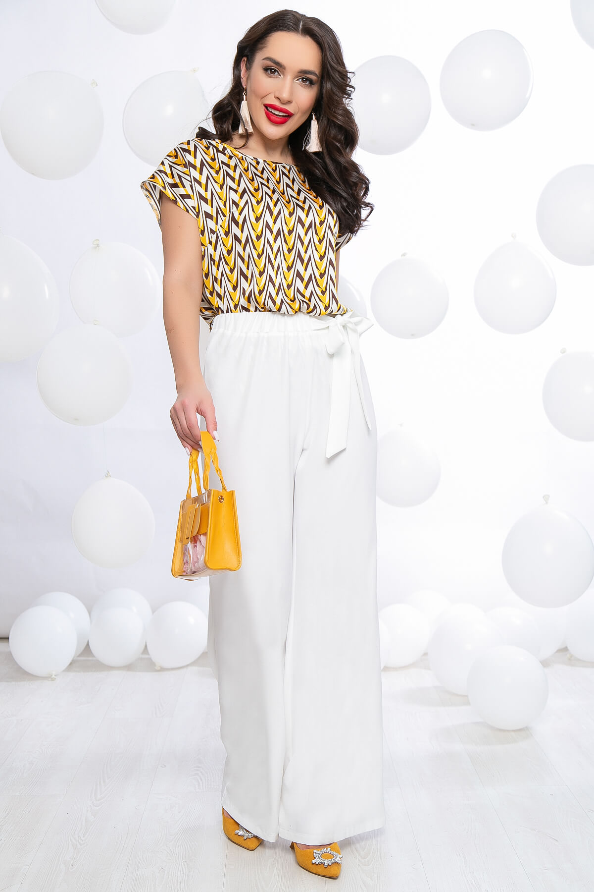 Костюм из лёгкой ткани отлично походит как для повседневной жизни, так и для праздничного мероприятия. Для более праздничного образа можно добавить украшения. В комплект входят классические белые брюки и яркая блуза. На брюках есть вшитый пояс, благодаря которому можно регулировать ширину талии. Блуза с коротким и цельнокроеным рукавом.