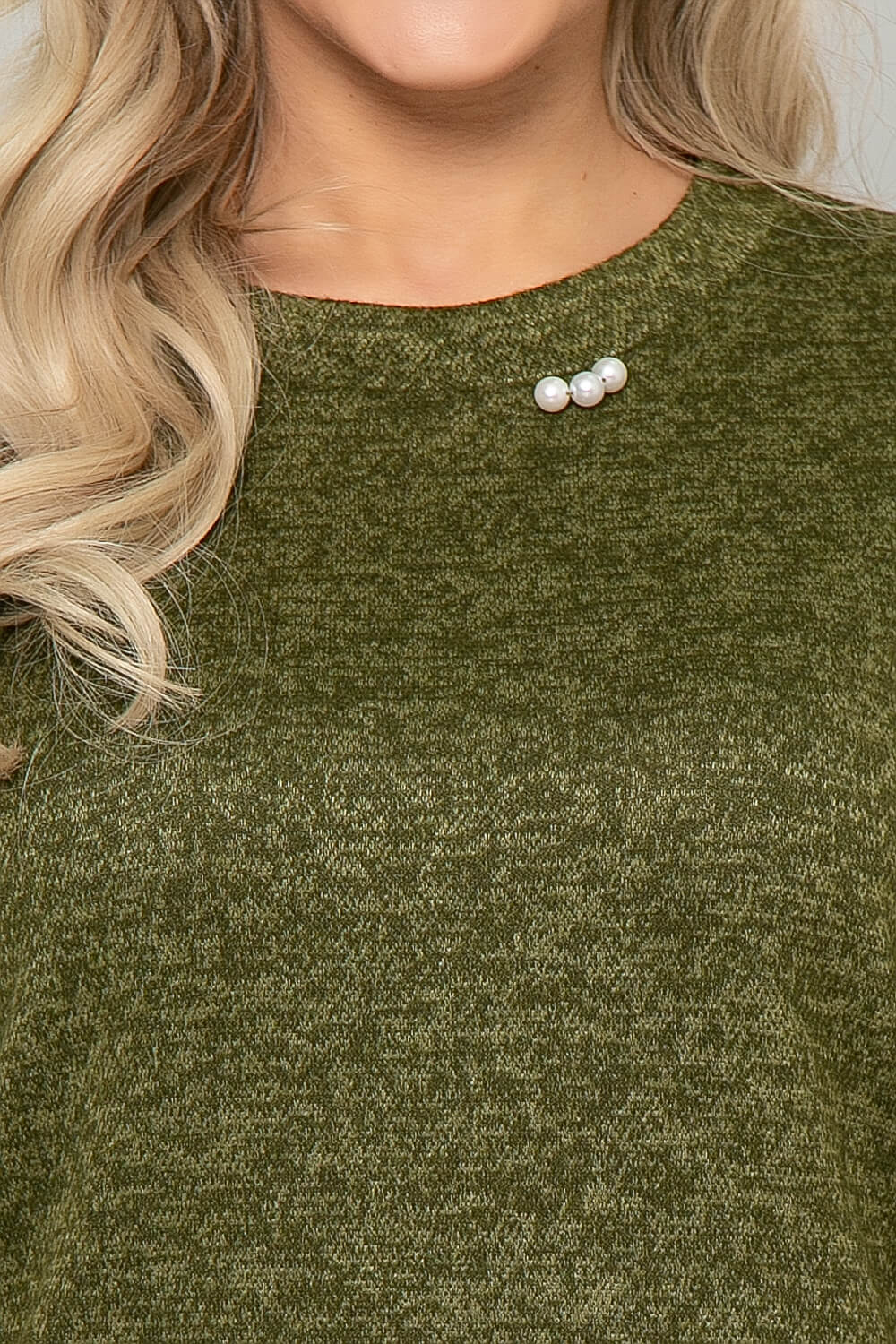 Костюм-двойка, состоящий из юбки на резинке и джемпера прямого кроя. Очень удобный комплект для создания стильного повседневного или делового образа. При желании подчеркнуть талию, верх можно заправить. Удлиненный джемпер прямого кроя имеет округлый вырез горловины и длинный рукав. Юбка прямого кроя, по талии на комфортной резинке, сзади есть разрез. Юбка без подкладки. По горловине джемпер украшен пришивными жемчужными бусинами.