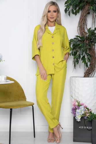 Летний брючный костюм из легкой ткани – один из лучших вариантов в жаркую погоду! В нём вы будете себя чувствовать уверенно и комфортно. Можно носить совместно так и раздельно. Этот брючный костюм подойдет как для дома, так и для выхода на пляж или вечернее мероприятие. Жакет свободного кроя на пуговицах, рукав 3/4 спущенный на манжете. Брюки полуприлегающего силуэта на резинке, есть карманы.
