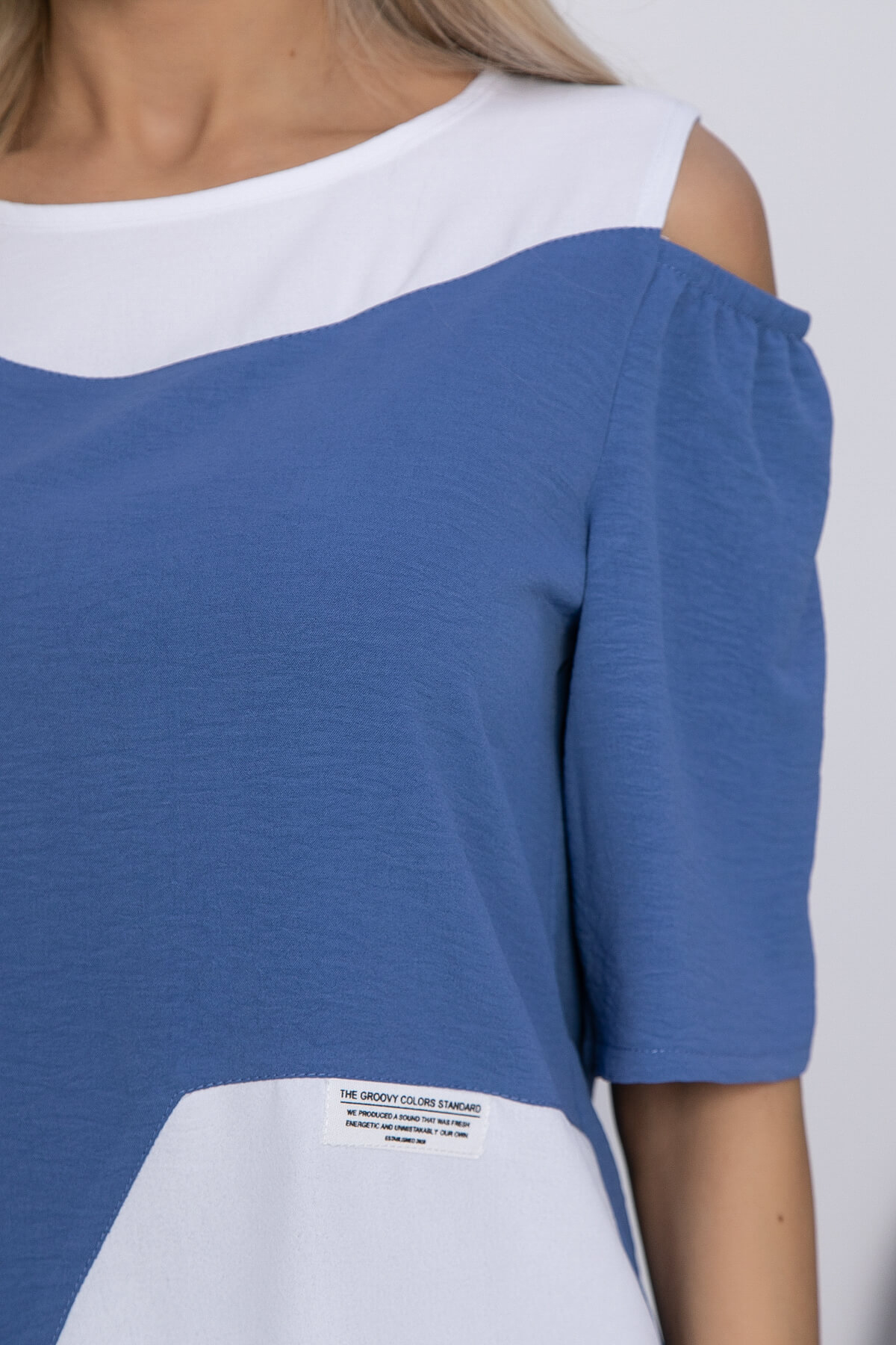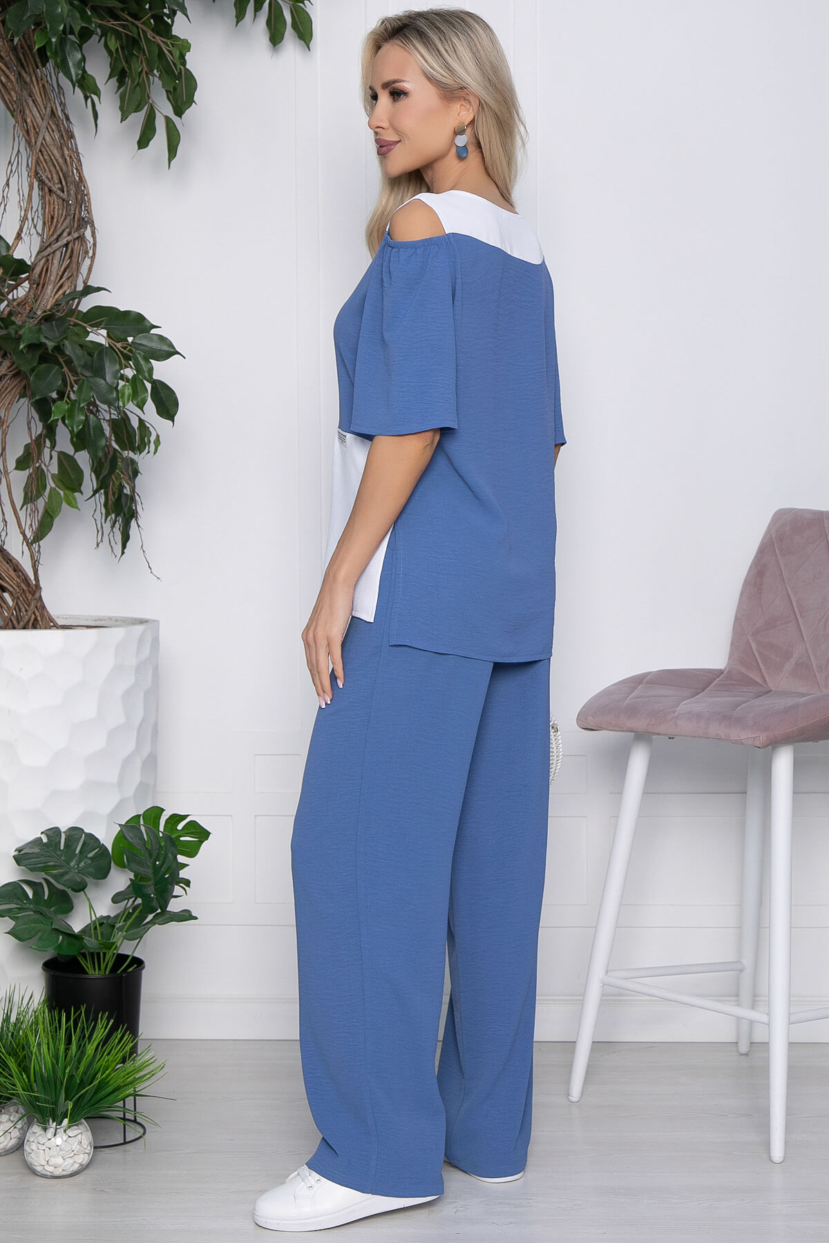 Универсальный, лёгкий и стильный брючный комплект, состоящий из свободной блузы и прямых брюк. Блузка двух цветов с фигурной средней частью по переду, с разрезами по бокам. Рукава с вырезами на плечах не оставят без внимания окружающих. Брюки по талии на резинке обеспечивают идеальную посадку, по бокам расположены карманы. Свободный крой костюма позволяет чувствовать себя комфортно, прекрасно сочетается с обувью на плоской подошве и каблучке.