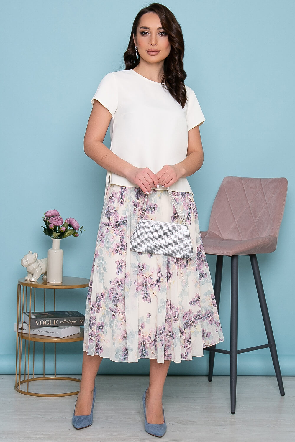 Очаровательный костюм из двух предметов: летящей юбки и блузы. Блуза свободного кроя. Мягкий, округлый вырез горловины, рукав короткий, втачной. По бокам разрезики, спинка удлинена. Юбка с высокой посадкой, на резинке, А-силуэта. Юбка на подкладке.