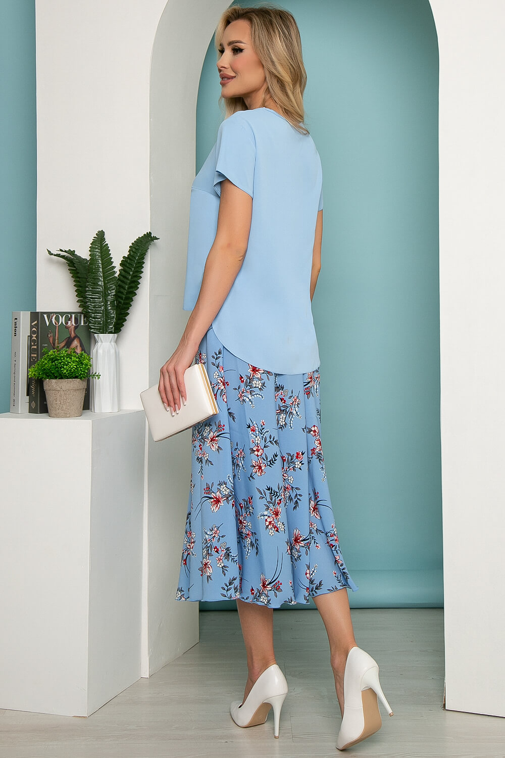 Очаровательный костюм из двух предметов: летящей юбки и блузы. Блуза свободного кроя. Мягкий, округлый вырез горловины, рукав короткий, втачной. По бокам разрезы, спинка удлинена. Юбка с высокой посадкой, на резинке, А-силуэта.
