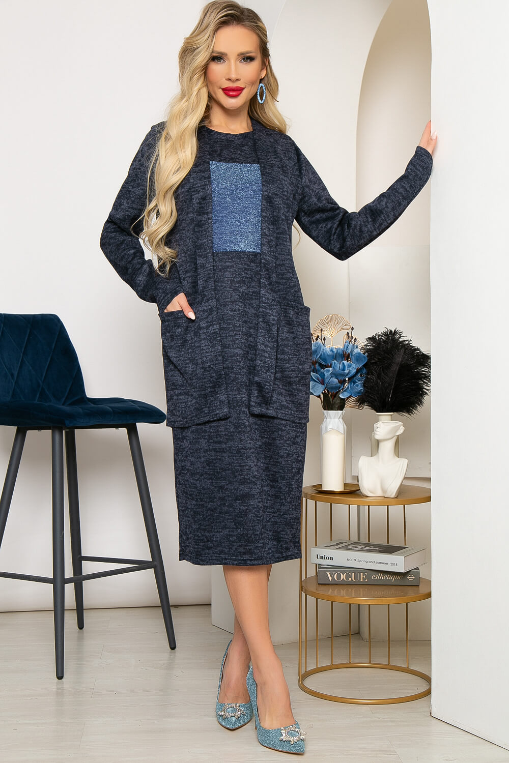Костюм-двойка из трикотажа, состоящий из платья универсальной длины и кардигана. Такой комплект избавит вас от переживаний на тему: "Что надеть?", ведь это уже готовый монохромный образ. Платье имеет лаконичный фасон, поэтому подойдёт практически для любого случая, а кардиган подарит тепло и комфорт в том случае, если вам станет прохладно. Платье полуприлегающего силуэта, рукав втачной, короткий. Кардиган же оснащен длинным рукавом и имеет свободный крой.