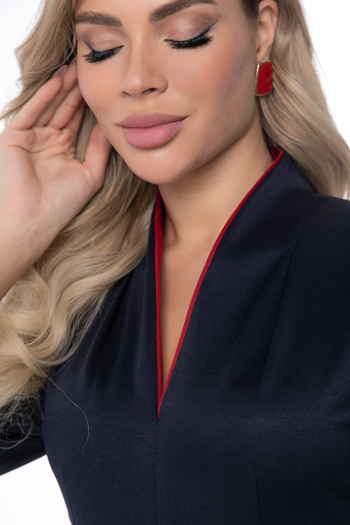 Платье - экспрессия! Элегантное сочетание тёмно-синего и красного цветов подчеркнут вашу индивидуальность. Крой юбки - полусолнце. По центру юбки встречная складка красного цвета. Рукава цельнокроеные, три четверти, с манжетами с разрезами на красной обтачке. Воротник стойка также выполнен с обтачкой красного цвета.