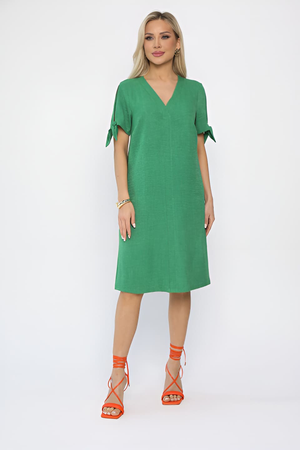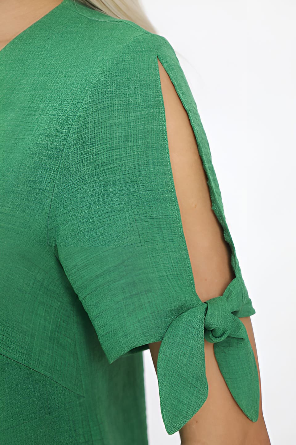 Платье средней длины станет идеальным дополнением вашего летнего гардероба. Горловина обработана стойкой, плавно переходящей в планку, что придаёт изделию особый шарм. Изюминкой модели являются короткие втачные рукава с разрезом сверху, которые заканчиваются завязкой-бантом, добавляя нотку романтики и утончённости. В комплекте с платьем идет пояс из той же ткани, позволяющий подчеркнуть талию и создать идеальный силуэт. Сочетайте его с любимыми аксессуарами и обувью для завершения образа!