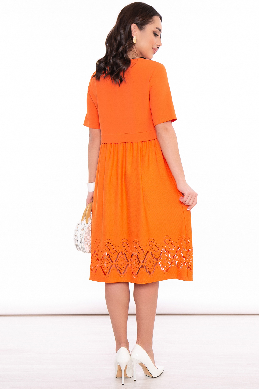 Яркое платье из комбинированных материалов прекрасно украсит весенне-летний гардероб. Яркие цвета являются абсолютными лидерами среди трендов этого сезона. Платье с отрезной линией талии, коротким рукавом и юбкой средней длины с перфорированными узорами по подолу. По переду декоративные пуговицы.