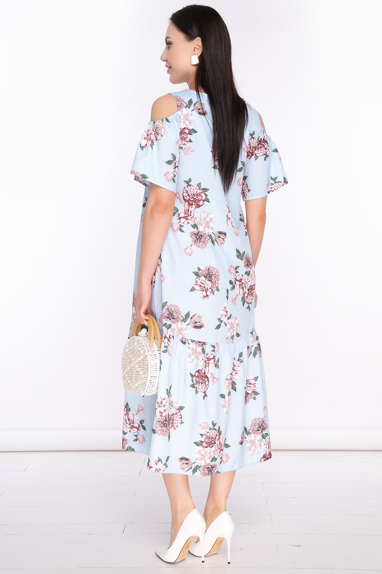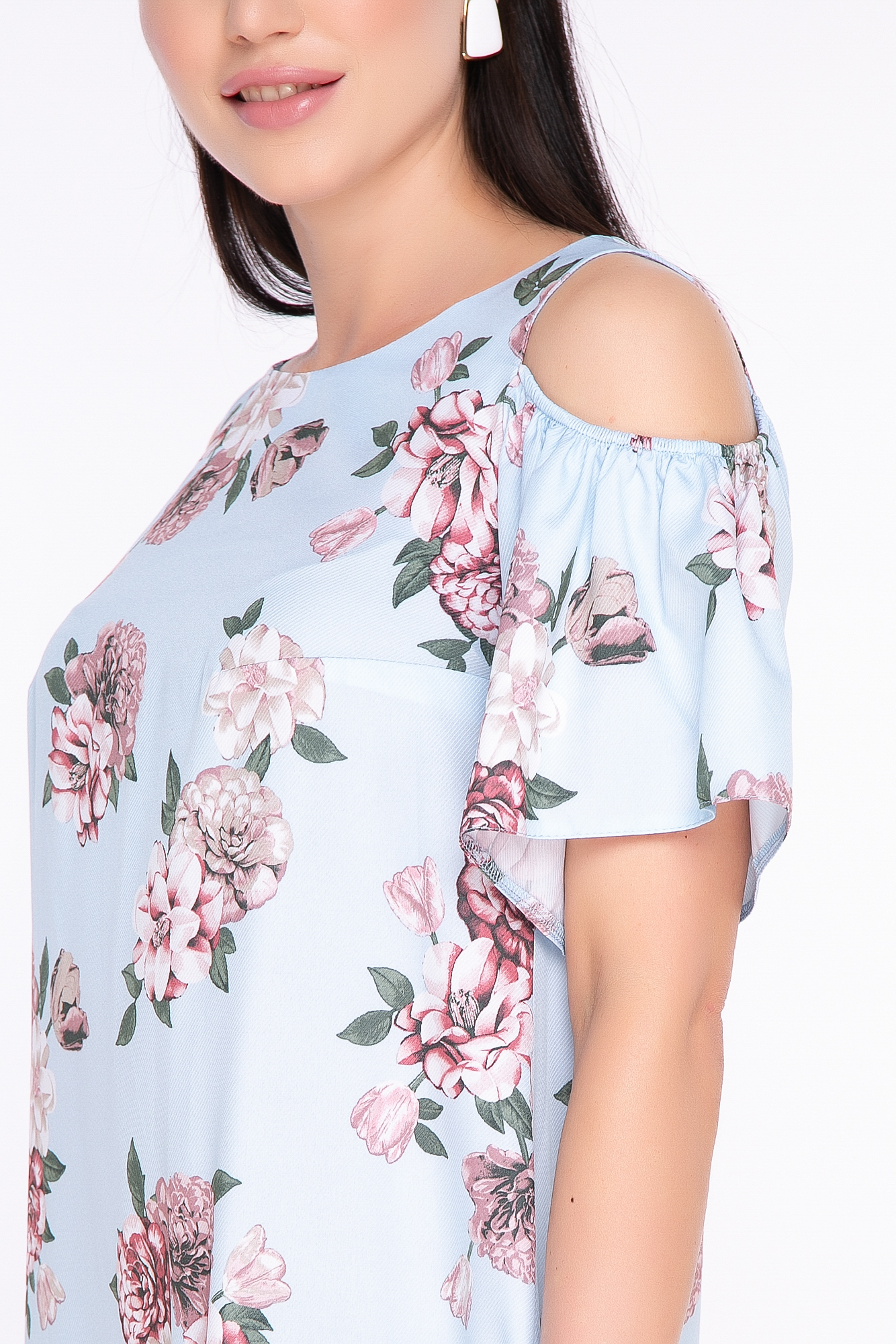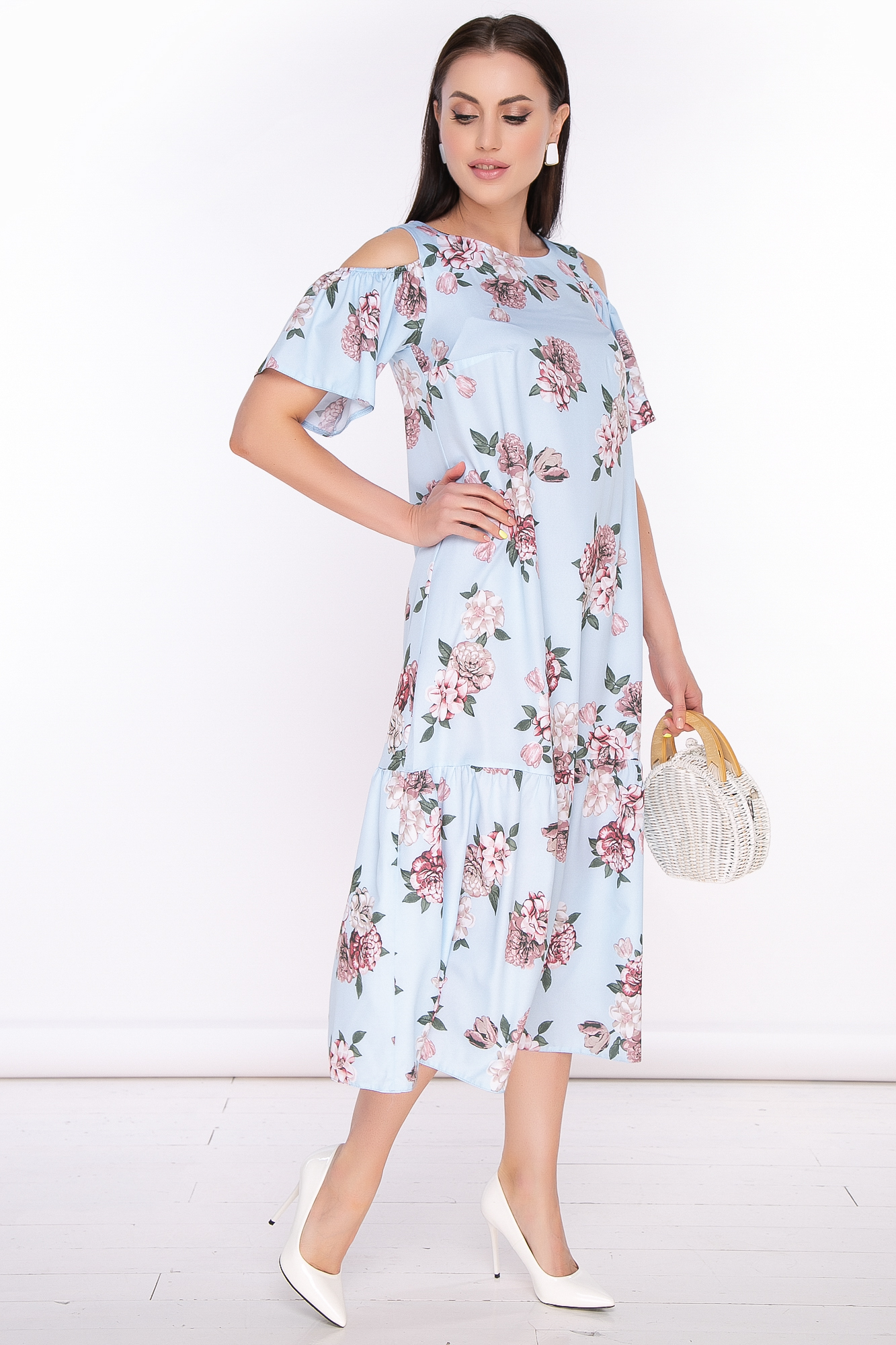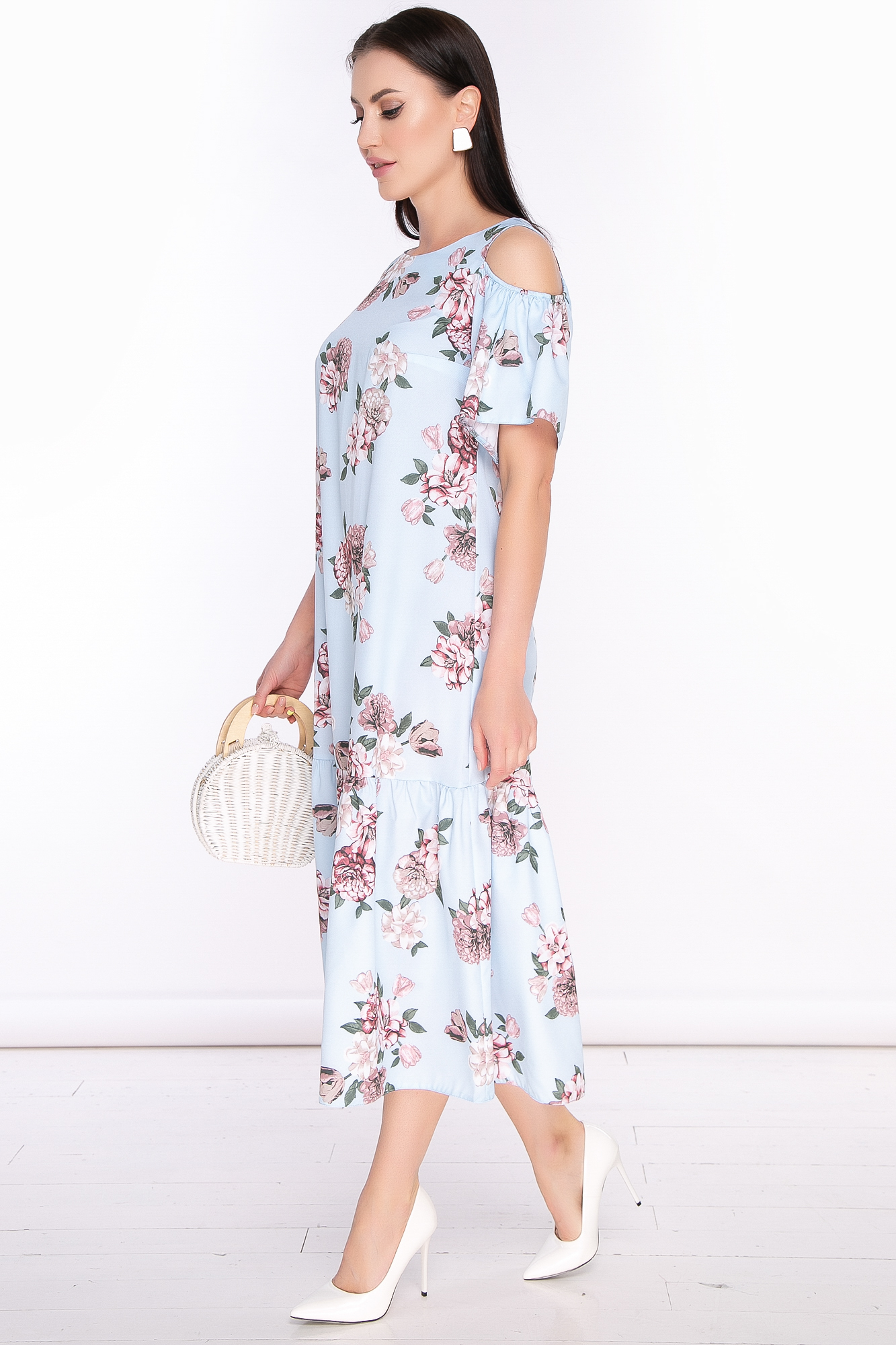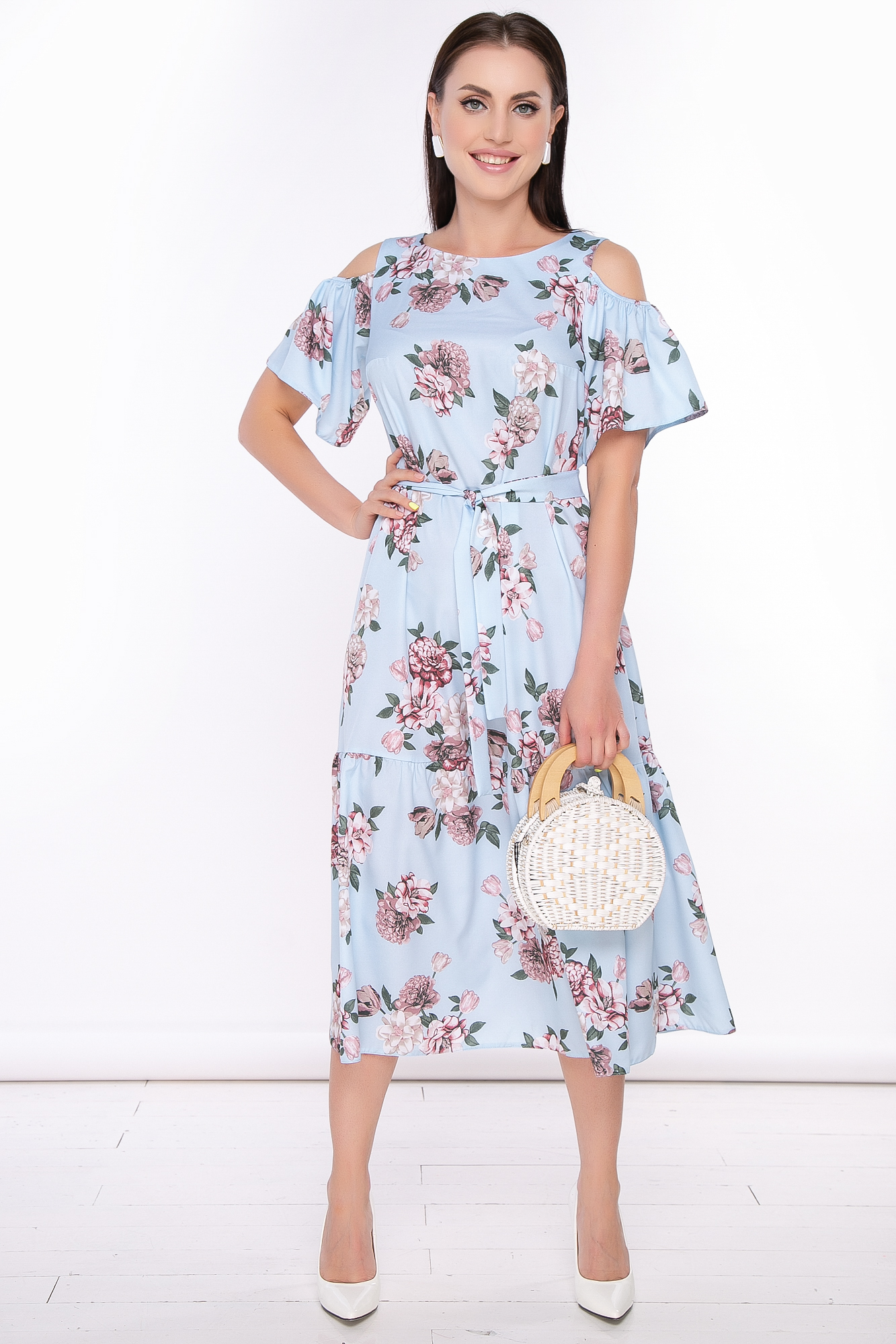 Элегантное платье свободного кроя в небесно-голубом оттенке прекрасно дополнит Вашу летнюю капсулу 2022. Шикарная свободная юбка, с широким воланом добавляет романтичности образу. Женственный летящий короткий рукав с открытым плечом. В комплекте идёт поясок.