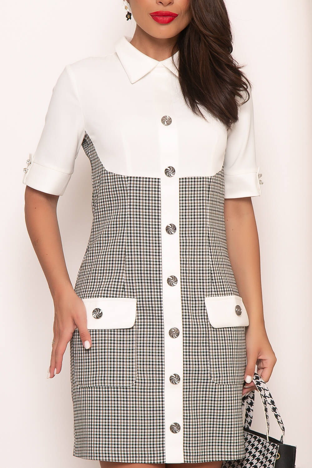 Платье-футляр для неподражаемого офисного образа. Платье прилегающего силуэта, по переду с акцентными вставками, визуально вытягивающими фигуру. Рукав укороченный, с на манжете. Классический отложной воротник добавляет образу собранности и лаконично его завершает. По переду платья есть накладные карманы, пуговицы декоративные.