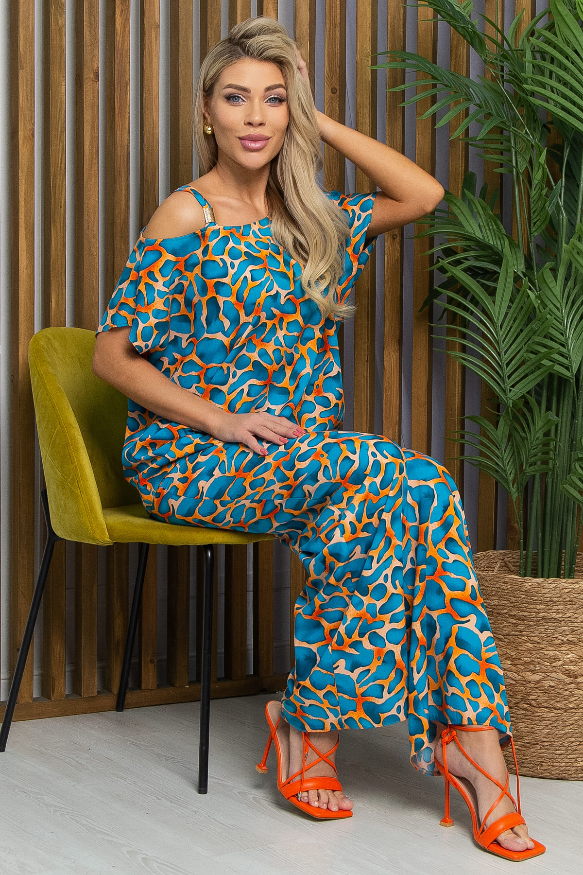 Легкий и одновременно изысканный, этот комплект отлично подойдет для повседневного ношения и отдыха на море. Костюм можно носить с каблуком и плоским ходом. Сочетание двух оттенков и стильный животный принт в ярком цвете создает уникальный образ, который точно будет привлекать восхищенные взгляды.