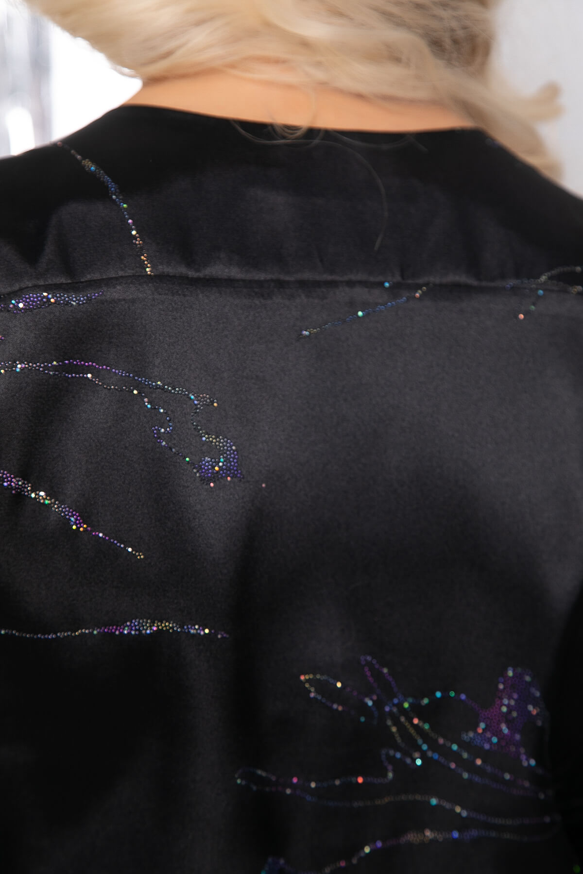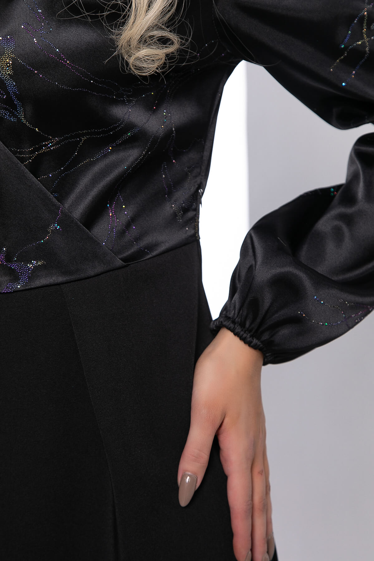 Элегантное платье создано для того, чтобы создавать слегка праздничное настроение. Изделие по переду украшено стразами. Рукав длинный, втачной, по низу на резинке. По низу изделия деликатный разрез. В комплект входит пояс из основной ткани.