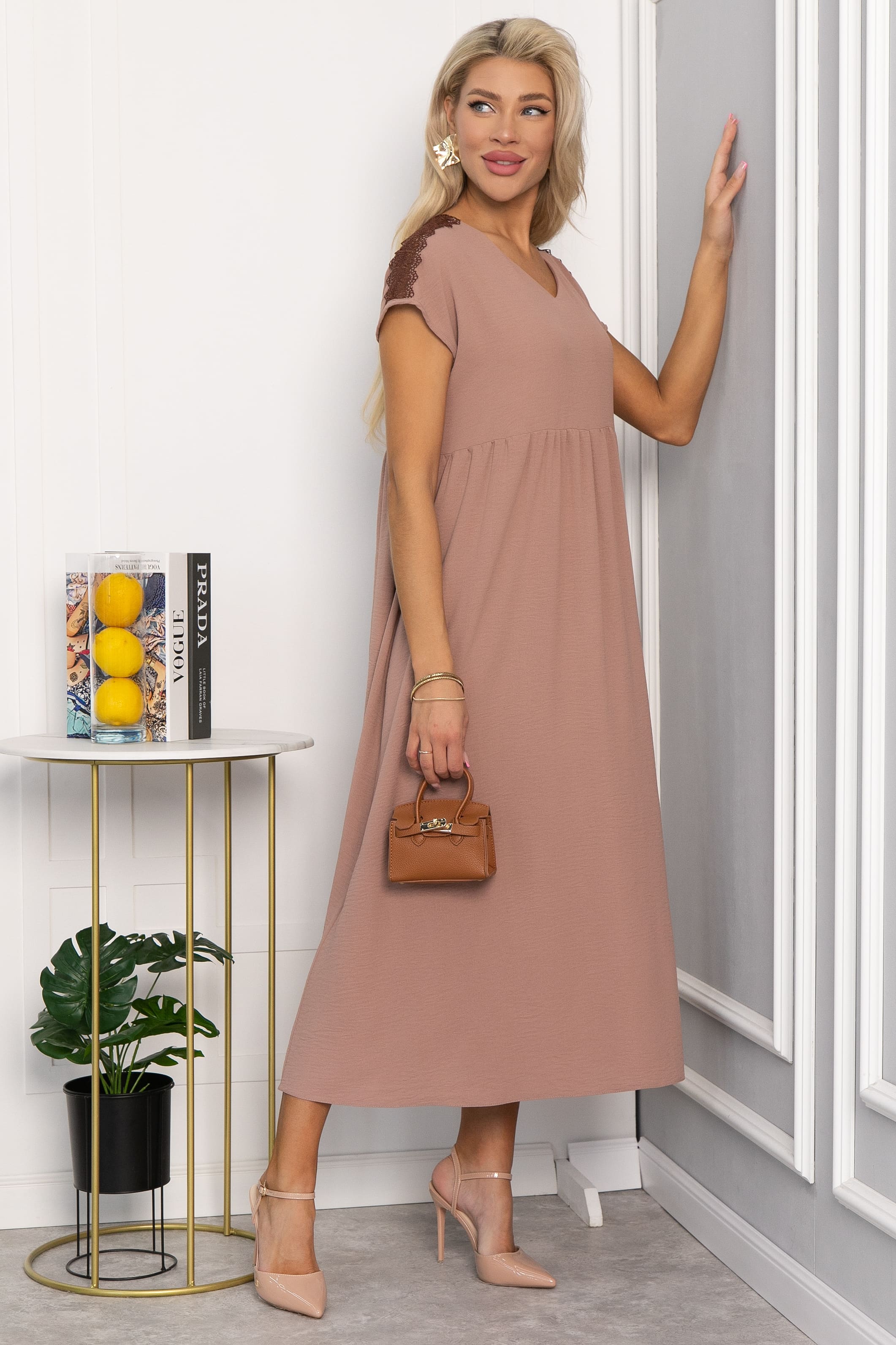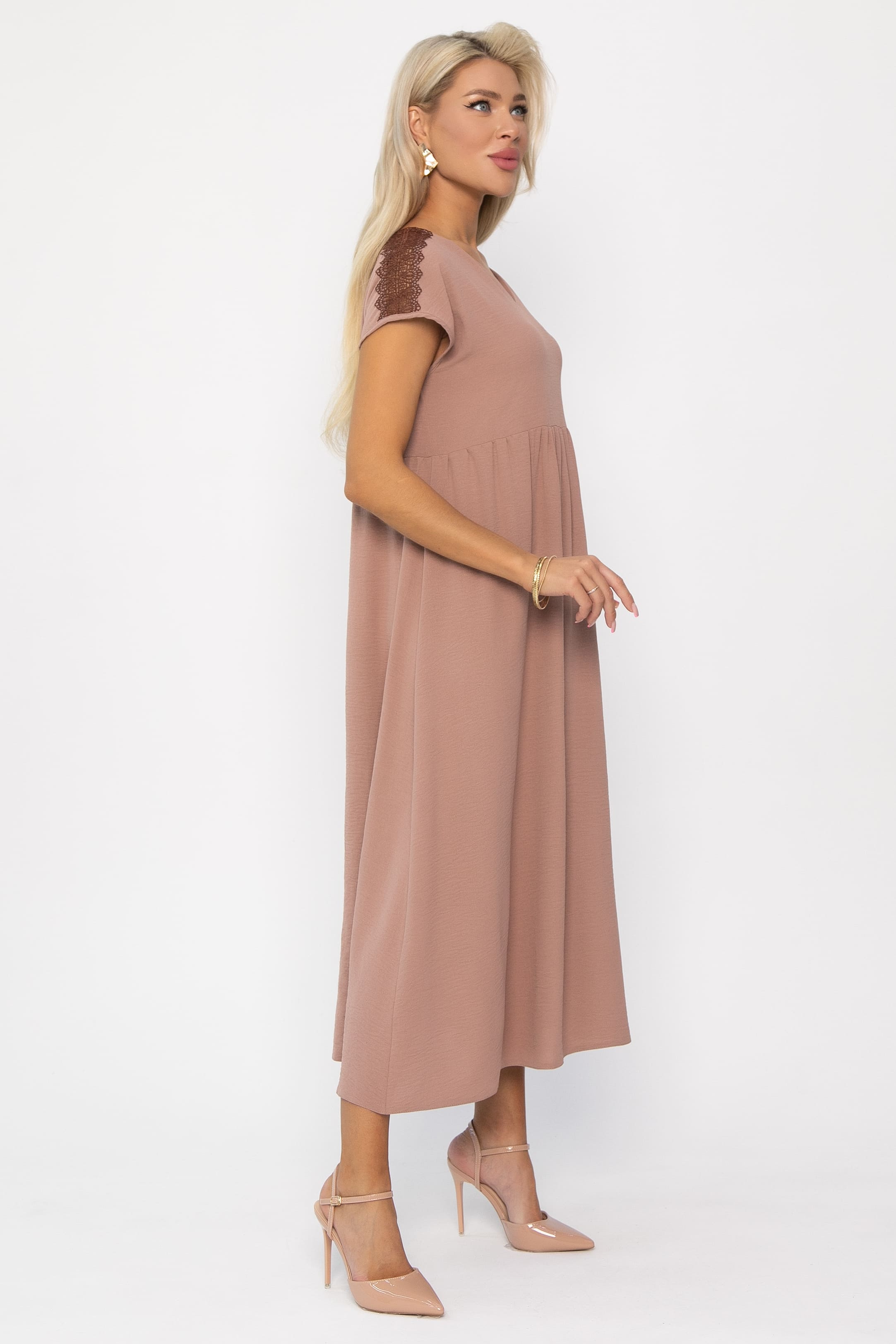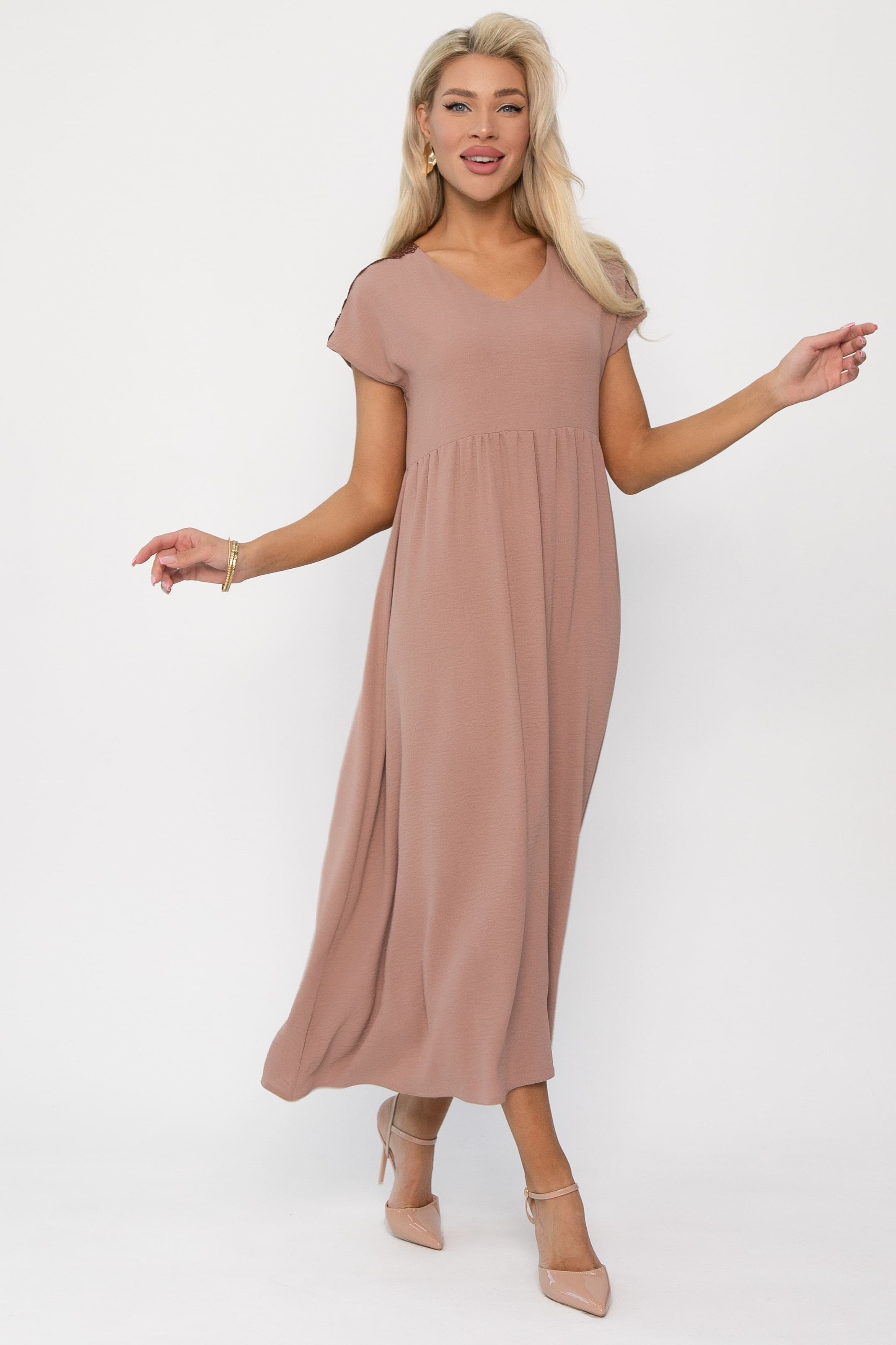 Стильное летнее платье без рукава — идеальный выбор для теплых дней, сочетая комфорт и элегантность. Платье имеет завышенную отрезную талию, подчеркивающую фигуру. Один пышный ярус юбки на сборке добавляет объема и воздушности, создавая эффектный и женственный образ. V-образная горловина визуально удлиняет шею и придает платью утонченности. Изюминка платья — кружевной элемент в плечевой шов, добавляющий нотку романтики и изысканности.